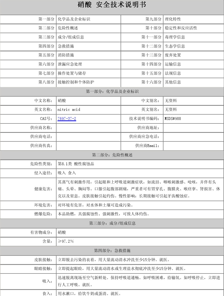硝酸又稱硝鏹水、鏹水、氨氮水、稀硝酸、濃硝酸、發(fā)煙硝酸。是一種強(qiáng)氧化性、腐蝕性的強(qiáng)酸。硝酸易溶于水,常溫下其溶液無(wú)色透明。其不同濃度水溶液性質(zhì)有別,市售濃硝酸為恒沸混合物,質(zhì)量分?jǐn)?shù)為69.2%(約16mol/L),質(zhì)量分?jǐn)?shù)足夠大(市售濃度為95%以上)的,稱為發(fā)煙硝酸。硝酸易見光分解,應(yīng)在棕色瓶中于陰暗處避光保存,嚴(yán)禁與還原劑接觸